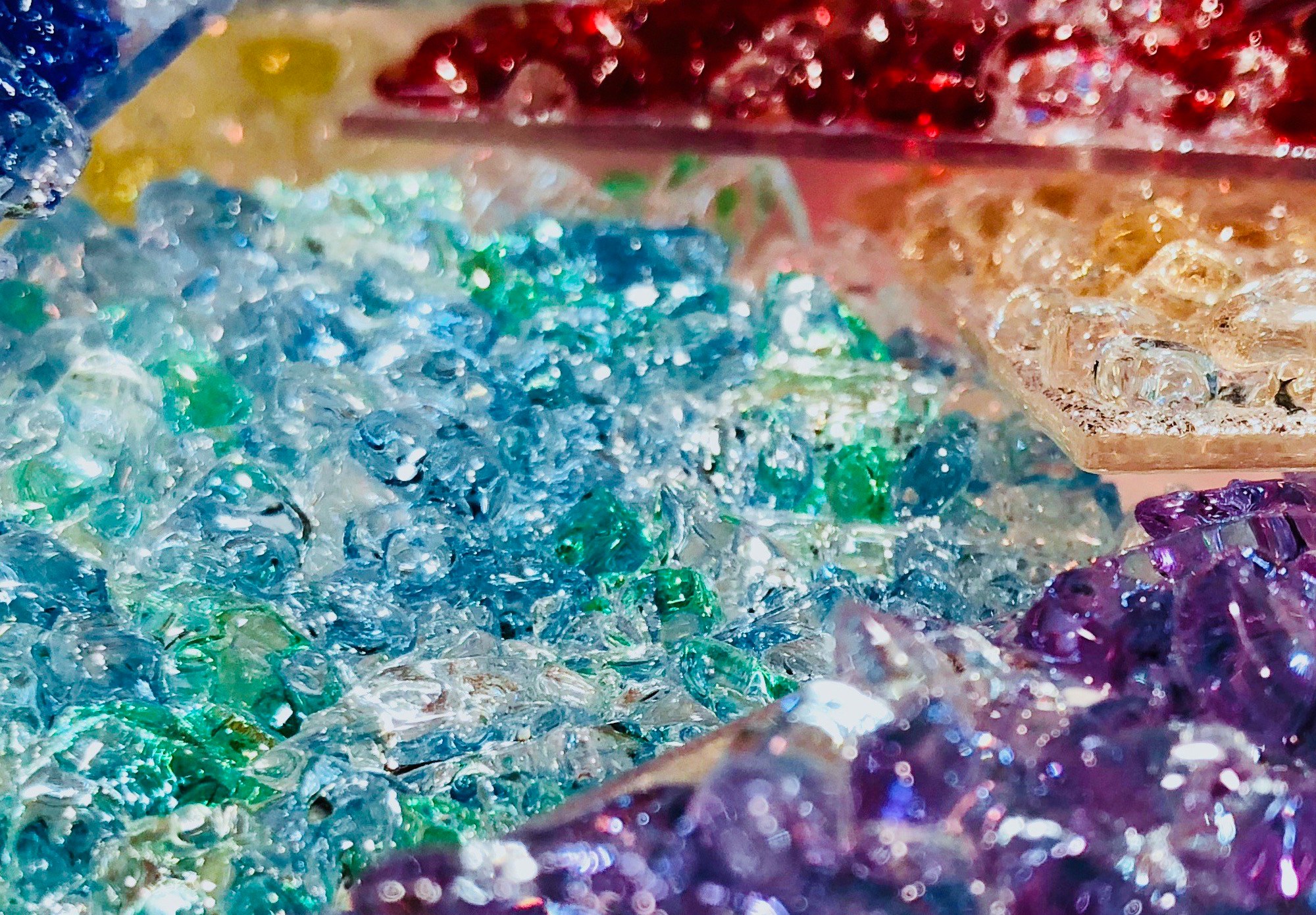 Lots of detail and awesome brilliance fired to just the right temperature in the kiln to hold it all together while maintaining much of the detail of each individual piece.