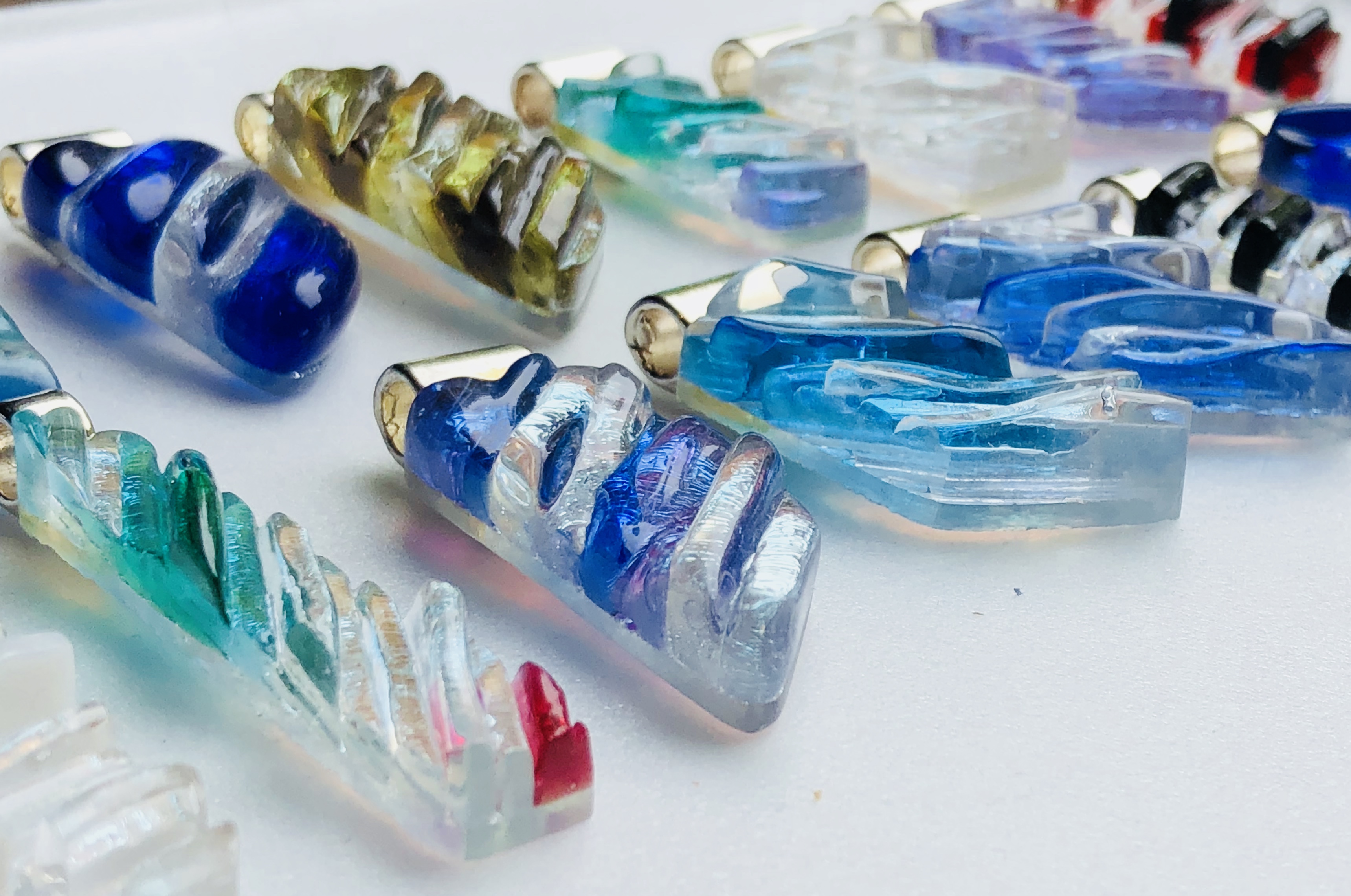 Strips of thin glass cut in the fluidity of ocean waves and then cut, shaped, polished and fire polished to maintain the shape of the waves. Each piece original, the next unpredictable – just like the real Atlantic Waves.